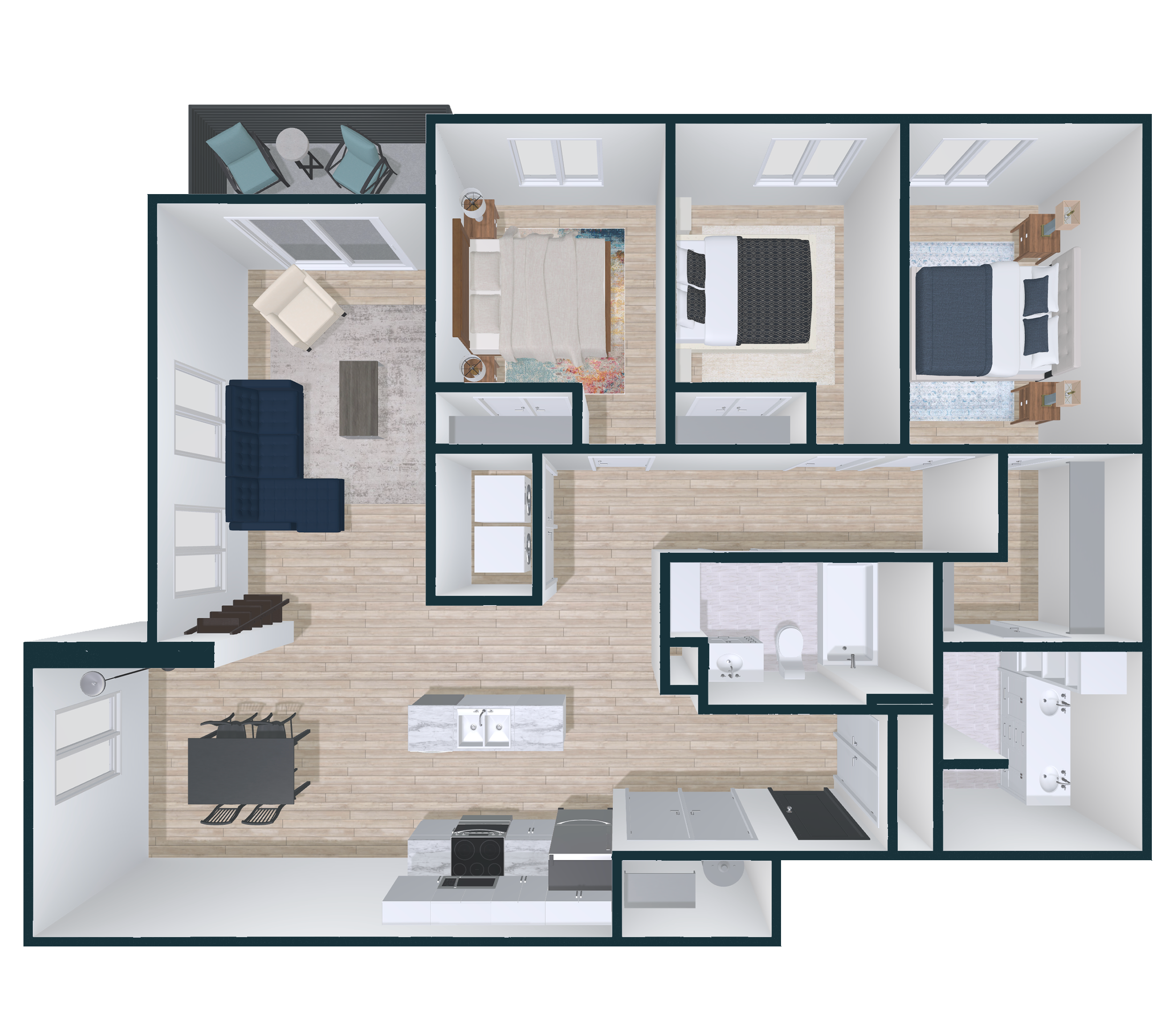 Spacious 3 Bed 2 Bath with 1,220 sq ft of light-filled living. Three generous bedrooms with ample closet space, open-concept living, large windows, and private balcony with panoramic views. Includes AC/heat pumps, in-suite laundry, walk-in closets, secure access, 2.5Gbps internet, storage units, select pet-friendly units and more.