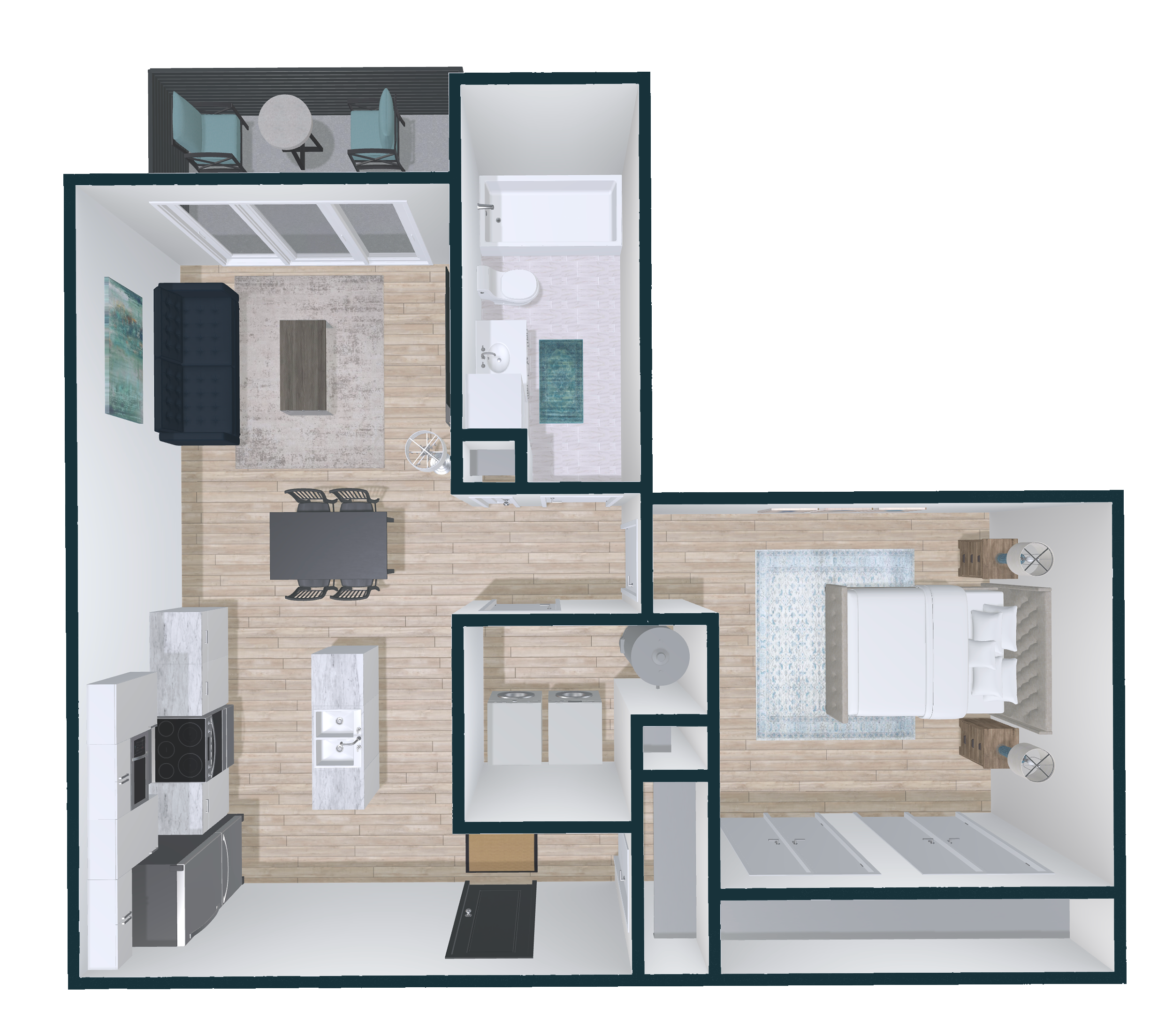 Airy 1 Bed 1 Bath featuring open-concept living, large windows, walk-in closet, and private balcony. Includes in-suite laundry and 2.5 Gbps internet, storage, secure access and much more