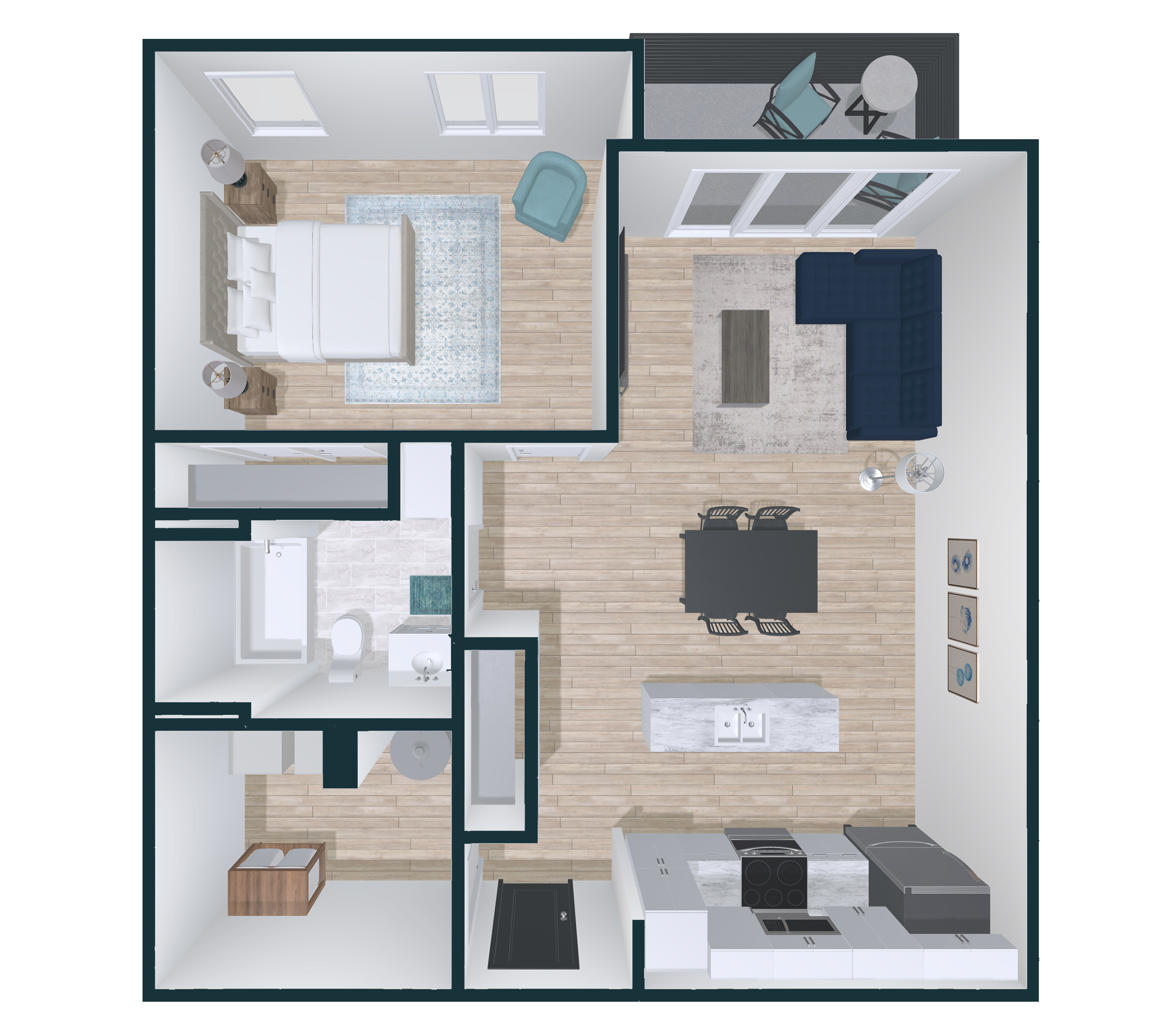 Serene 1 Bed 1 Bath with contemporary bathroom and bright living area. Large windows, private balcony, AC/heat pumps, in-suite laundry, washer/dryer hookups, 2.5 Gbps internet, and pet-friendly, secure building amenities.